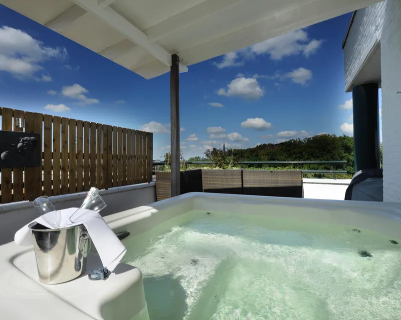 A suite on the highest point of the hotel, a bubble bath on the balcony and the view over Almelo. Book this spacious two-person suite for ultimate weekend in Almelo. This suite has not only freestanding whirlpool, two-person shower, but obviously espresso machine, toilet, hairdryer, sitting area, (laptop) safe, small fridge and TV.